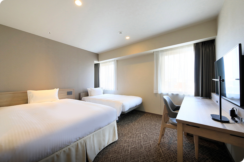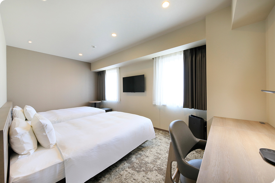 グレージュ調の落ち着きのあるインテリアで統一された空間は、2名様がゆったり寛げるゆとりを確保し、ビジネスのみならず、ファミリーやカップルでのレジャーシーンでも快適にご利用いただけます。